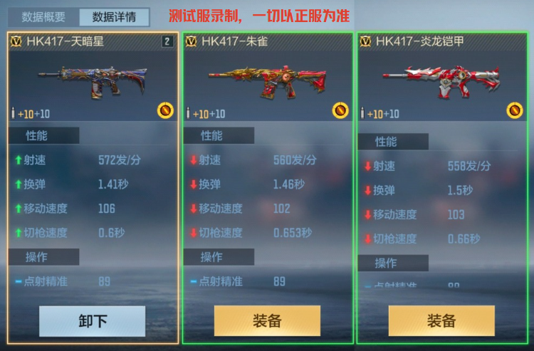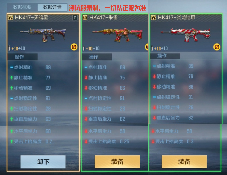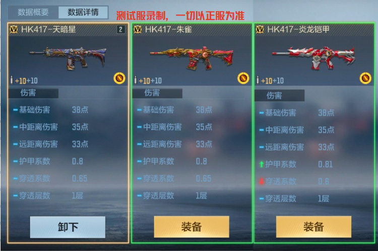 这里对比了同系列的HK417-朱雀和HK417-炎龙铠甲,大家可以看到HK417-炎龙铠甲的护甲系数要高于HK417-天暗星,但HK417-炎龙铠甲的穿透系数要低于HK417-天暗星,其他数据三把武器一致。HK417-天暗星的优点就是基础伤害较高,这样的高伤害在实战中非常有优势。