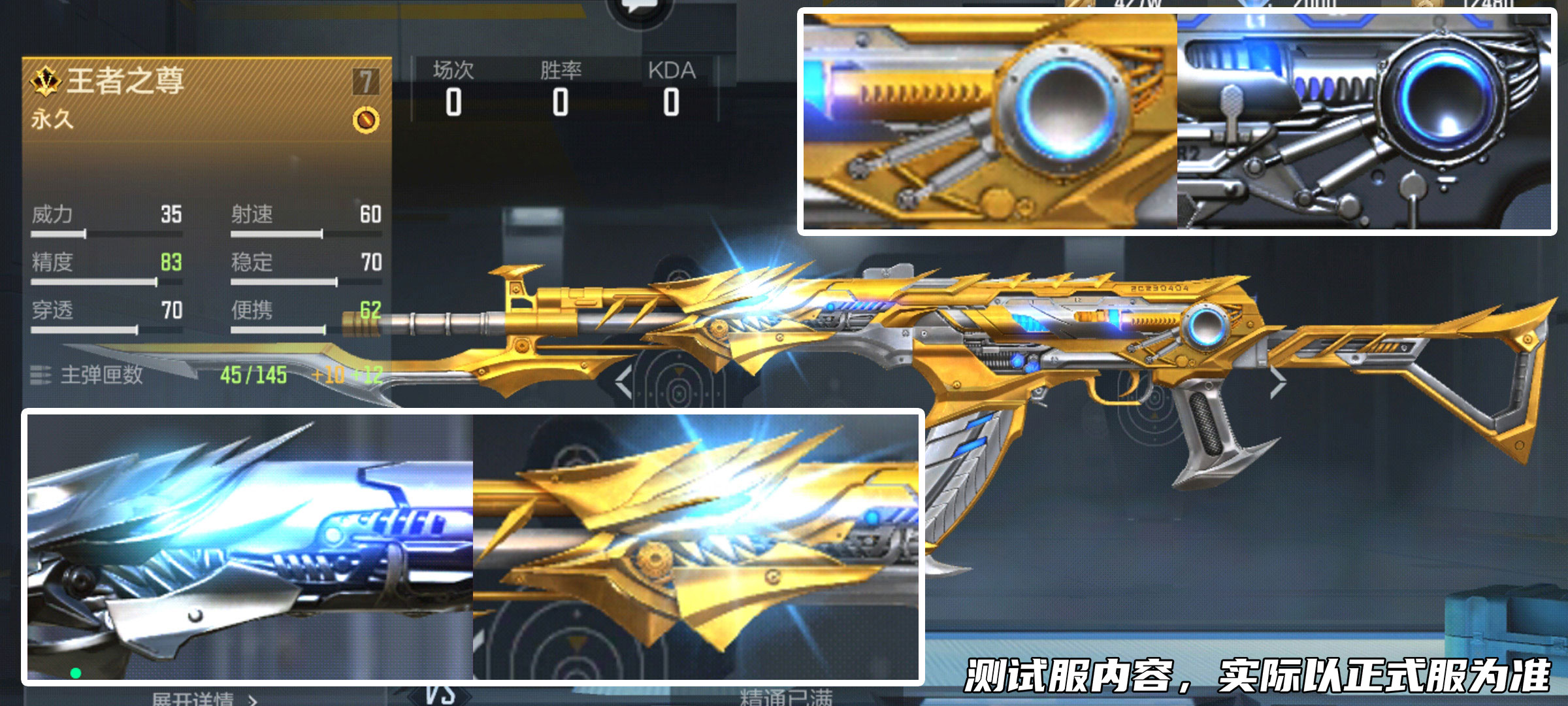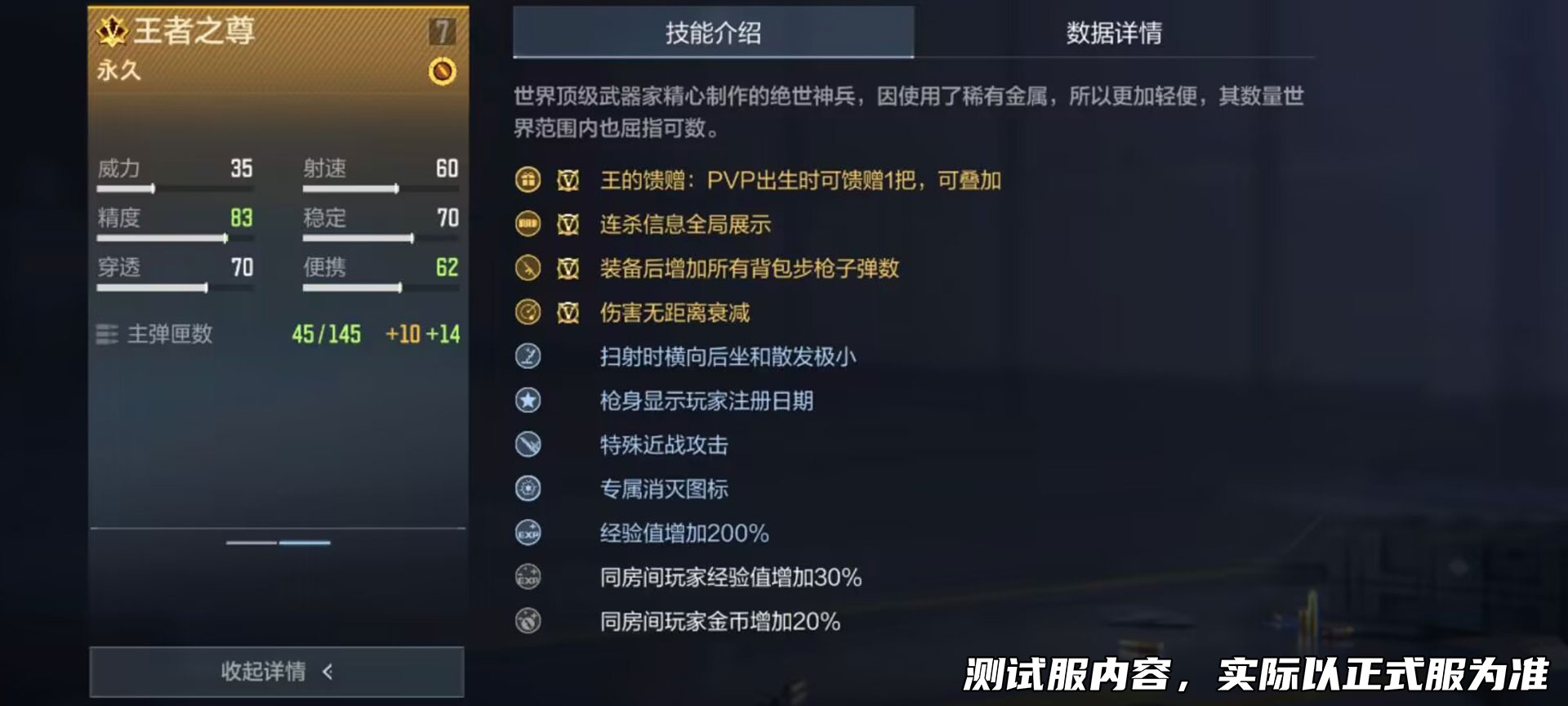 枪械技能介绍页面所看到的信息不多,最后再带大家看看当前体验服版本的王者之尊数据: