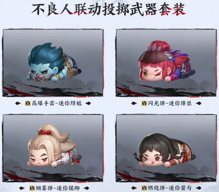 本次上线的不良人夺宝活动包含四款投掷道具,其中包括:高爆手雷-迷你焊魃、闪光弹-迷你降臣、烟雾弹-迷你侯卿、燃烧弹-迷你萤勾,这四款都是萌化版尸祖投掷物各有各的特点,每款投掷物捏脸互动时五官会随手指动作微动,投掷后仍保持萌趣姿态,辨识度与收藏价值极高。