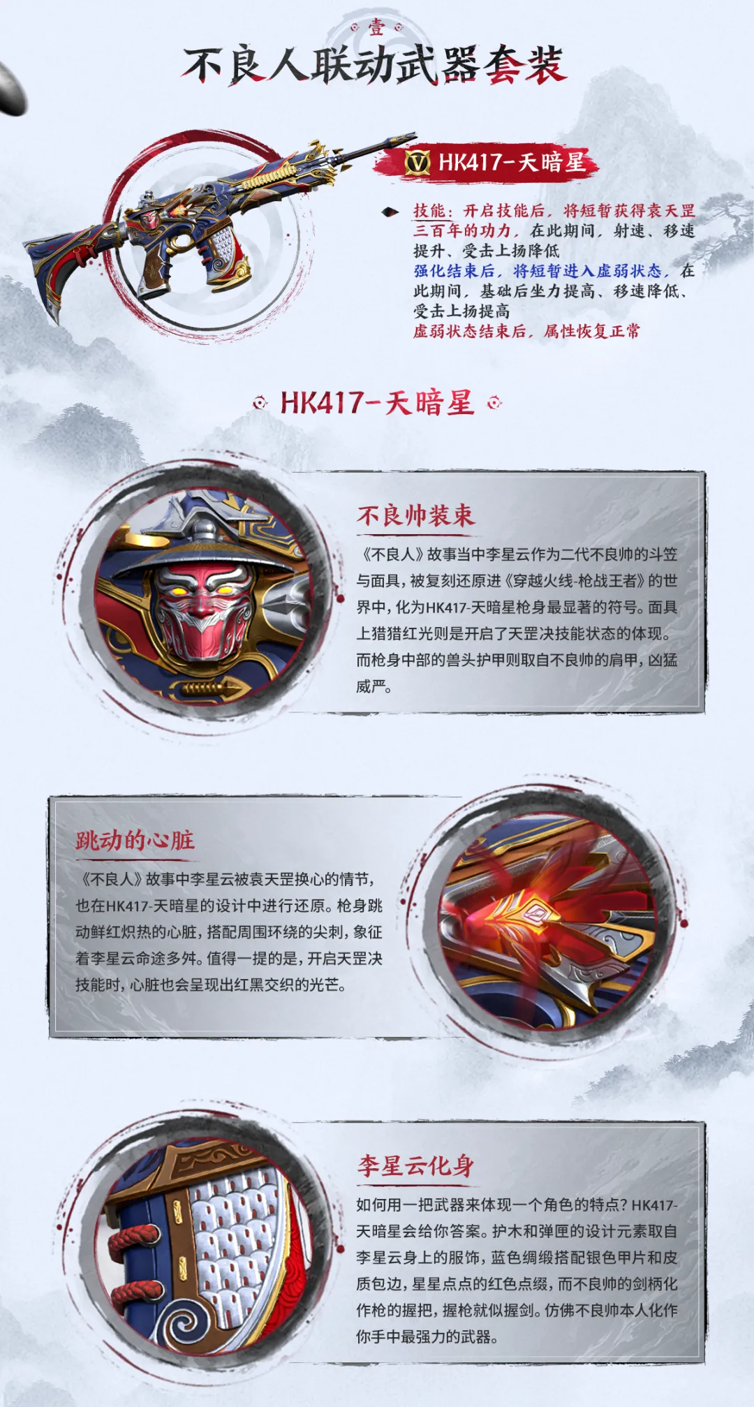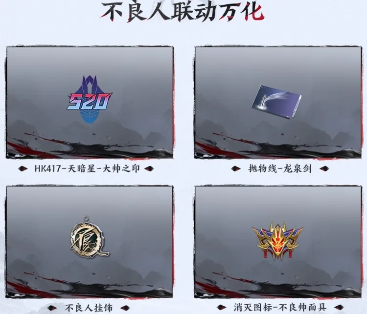 本次还将上线一批不良人联动万化,其中包括HK417-天暗星-大帅之殇、大帅之印、大帅之触、还有消灭图标-不良帅面具、不良人挂饰、消灭音效-不良人、抛物线-龙泉剑等!
