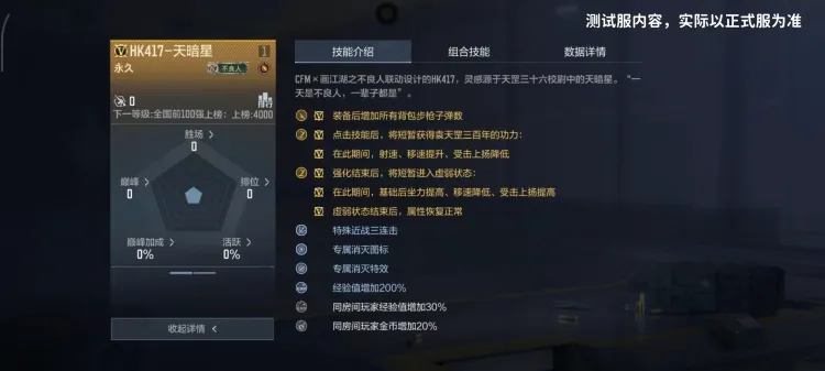 HK417-天暗星拥有特色技能,玩家按下技能后可短暂提升射速及移速,降低受击上扬,加成效果结束后进入短暂虚弱状态,在此期间基础后坐力提高、移速降低、受击上扬增加,一段时间后可恢复至常规状态。