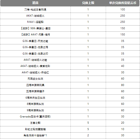 看完奖池奖励,接下来是商城兑换奖励。其中不仅返场了往年的纪念武器以及各种纪念道具,而且还上架了G36-李星云的专属武器万化道具,包含G36-李星云-天觉之触、G36-李星云-龙泉之殇、G36-李星云-龙泉之印。喜欢的小伙伴可以顺手拿下,全部装备后还能提升枪械手感,让你枪枪爆头不在话下。