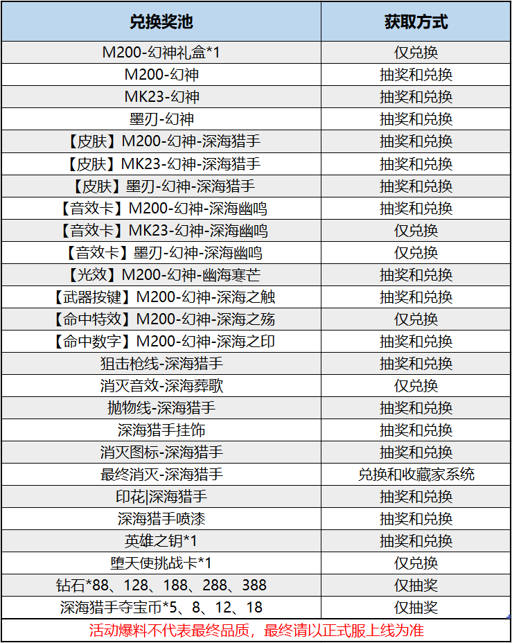 深海猎手夺宝活动奖池与兑换池内容非常丰富,各位看官可直接点开表格查看:
