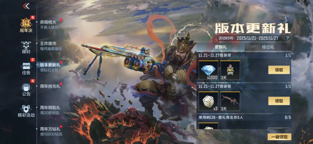 版本更新后登录即可领取1000钻、王者之骰x3。另外,在版本更新礼活动中还可以领取到粘性手雷-彩虹小白马觉醒(3天)和MG36-魔礼青(3天),一起来体验新武器哦!使用MG36-魔礼青击杀5人还能再领取1个王者之骰~