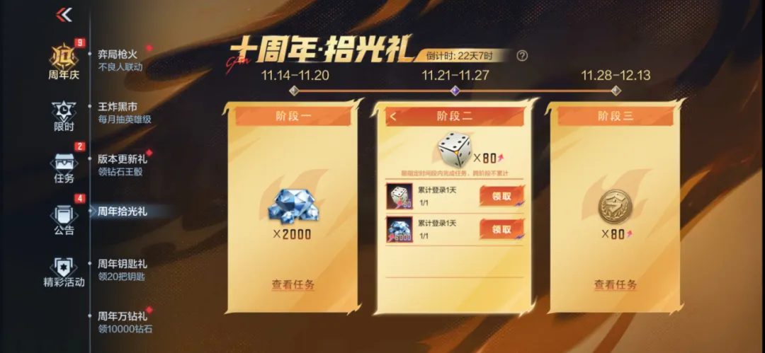 累计登录福利加码,诚意拉满!累计登录1周就领5000钻,累计登录3周领2000钻,累计登录3周再领2000钻!总共10000钻,就是这么直接~登陆就送,这波周年庆钻石拿到手软