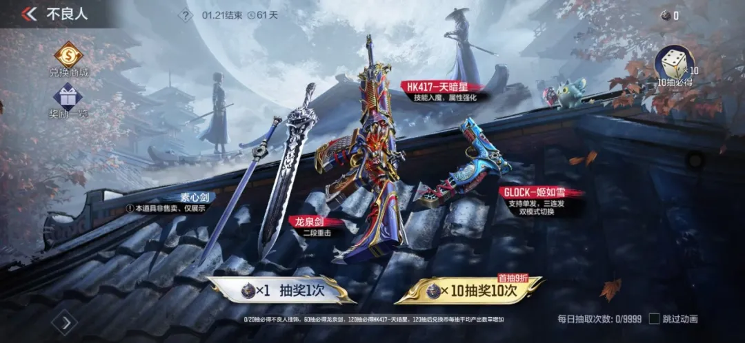 不良人联动重磅活动之一——不良人夺宝,带来了七款不良人系列武器。其中包括主副近三件套:HK417-天暗星、GLOCK-姬如雪、龙泉剑;还有投掷物四件套:高爆手雷-迷你焊魃、闪光弹-迷你降臣、烟雾弹-迷你侯卿、燃烧弹-迷你萤勾。