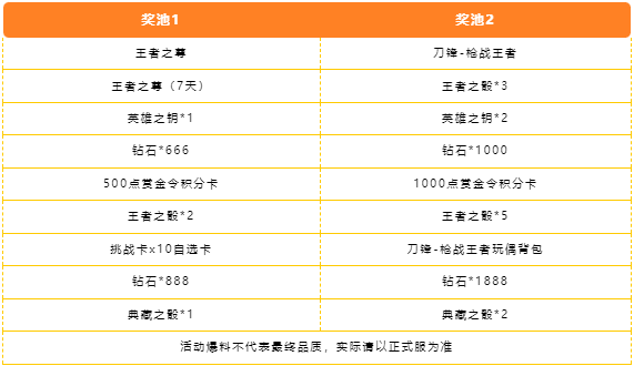 活动规则与王者轮回接近,本次福利活动的活动奖励也完全可以与王者轮回相提并论,当然,参与也是完全免费!活动共分为两个独立奖池,奖池中的道具都非常实用,除了王者之尊以及刀锋-枪战王者外,将两个奖池全部抽完可获得3把英雄之钥、4442枚钻石、1500点赏金令积分卡、13枚王者之骰、3枚典藏之骰、10张挑战卡自选卡等道具,这波福利够不够狂欢!