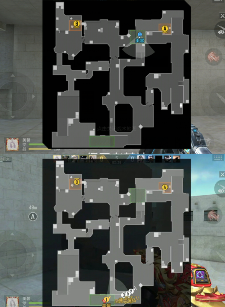 同时,局内小地图的底图也做了相应的优化,从之前纯黑色的底板改为半透明的设计,便于玩家查看小地图时能更清晰地观察周围环境。大家可以通过新旧对比看到,新版本优化后,下方底色有明显差别。