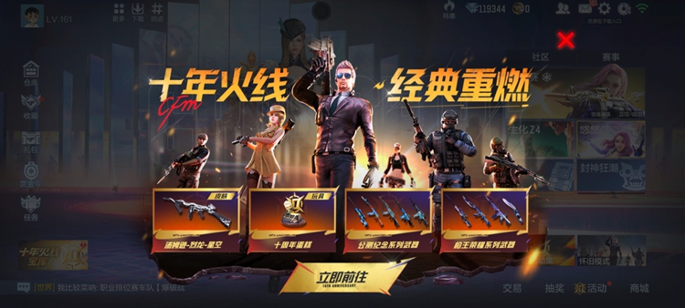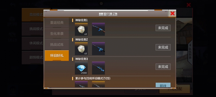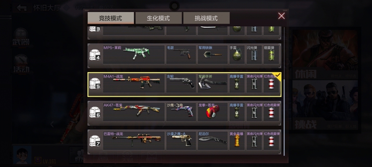 紧接着来到怀旧大厅,十年老玩家的你是不是非常地熟悉呢?左边是武器和活动,而右边则是游戏类型。分为竞技、休闲、剧情以及挑战四个模式。每一个模式都有曾经我们最喜欢的地图,都有我们战斗过的地方。