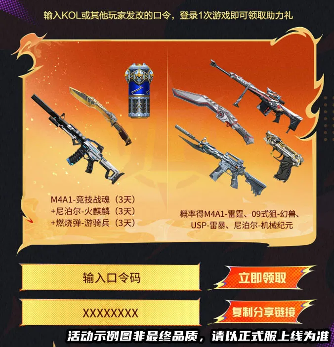输入KOL或其他玩家发改的口令,有机会得到AK47-雷暴、巴雷特-变色龙、USP-雷暴、尼泊尔-火麒麟等英雄级武器~