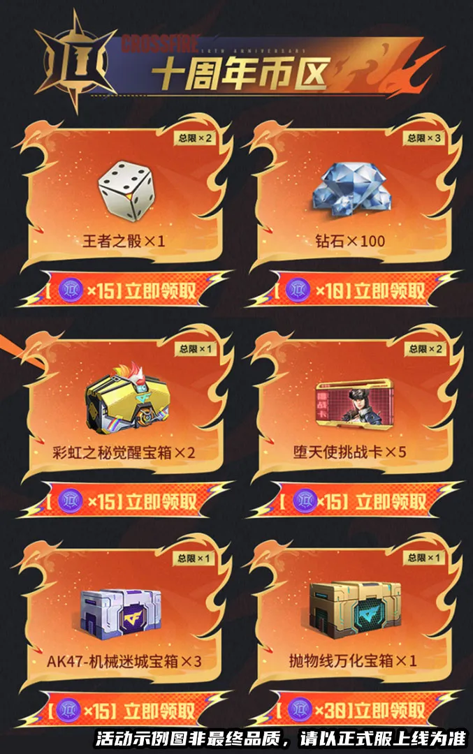 十周年币区提供了王者之骰、钻石、彩虹之秘觉醒宝箱、堕天使挑战卡、AK47-机械迷城宝箱、抛物线万化宝箱等道具的兑换。