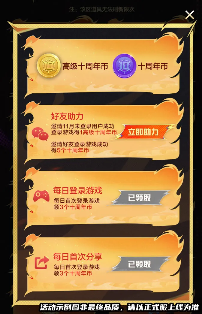 代币获取方式大家都知道,每日登录游戏和每日首次分享均可获得十周年币。值得注意的是,在本次宝库中,每日登录给的普通币比以往多一个。邀请11月未登录的用户成功登录游戏可获得高级十周年币x1,邀请好友登录游戏成功可获得十周年币x5。