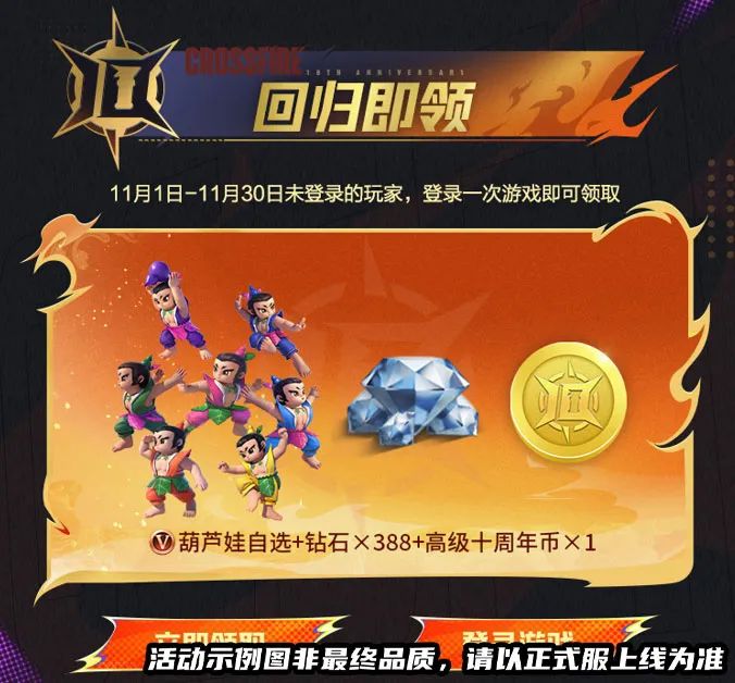 11月未登录的玩家登录一次游戏后,可到宝库的回归专属界面领取葫芦娃自选卡(铜V)、钻石x388、高级十周年币x1。