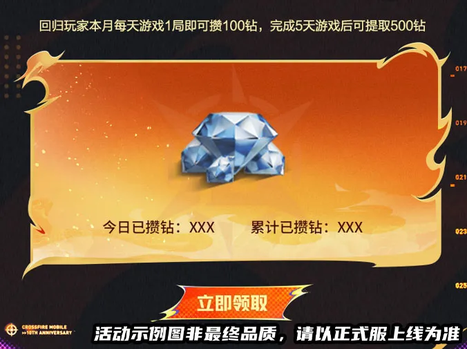 不仅如此,回归玩家每天玩1局游戏还能攒100钻石,完成5天游戏后即可一次性领取500钻石。