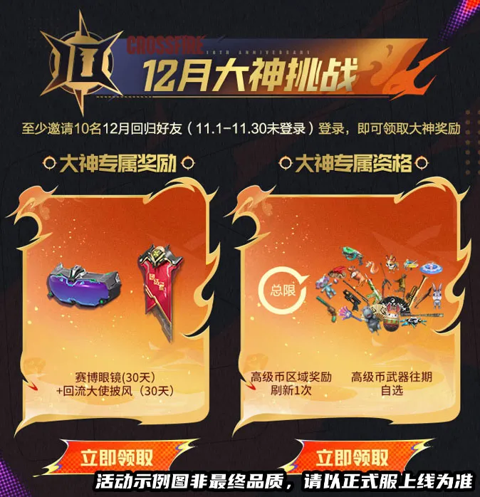 最后来看到大神挑战板块,只要成功邀请至少10名11月未登录的回归好友,就能解锁大神专属奖励:赛博眼镜(30天)与回流大使披风(30天),还能获得大神专属资格,高级币区域奖励刷新一次,同时可自选一款高级币武器往期道具。