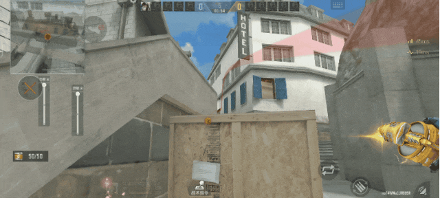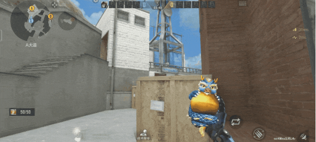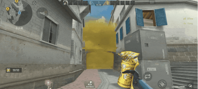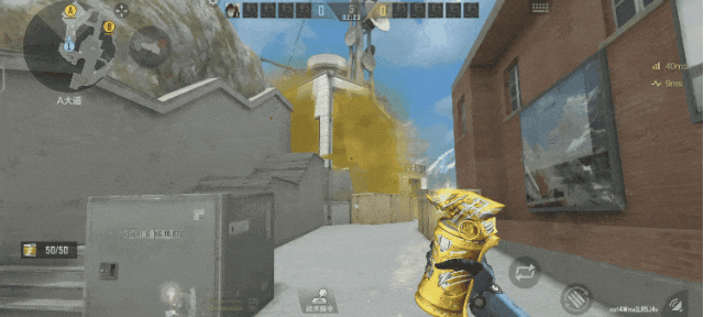 来到A大,将准星对准楼梯旁边墙壁的最高点,瞄点向这个第三段墙檐的中部移动,当抛物线的反射只有一次时投出,需要注意抛物线的落点在白房的位置而没有掉下来,这样就投出了一颗进攻A大时对白房枪线和包点大部分枪线的隔断烟,帮助我们更好的进攻A包点。