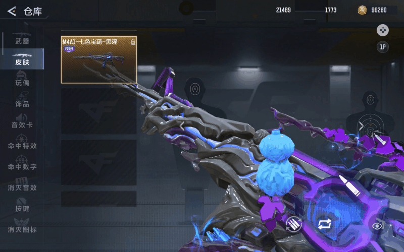 而M4A1-七色宝葫装备黑曜后,以神秘高贵的紫黑色调与黑曜石质感重塑枪身,原本的原木色变为通透黑曜石材质,绿色藤蔓转为暗紫色,,枪身流淌着蓝色泉水特效并汇聚于中心的蓝色水葫芦,开火与换弹时还会环绕酷炫蓝色流光,击杀效果也从彩色变为深邃黑色,质感拉满。