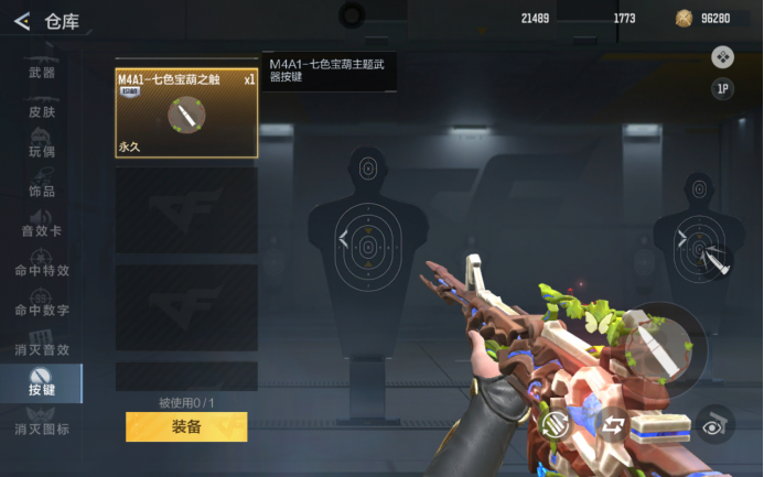 【武器按键】M4A1-七色宝葫-葫芦之印并不是一味的复制葫芦造型,而是将射击按键的一圈缠绕着三段深棕色藤蔓纹理,藤蔓节点处点缀着绿色葫芦叶,精致感十足。