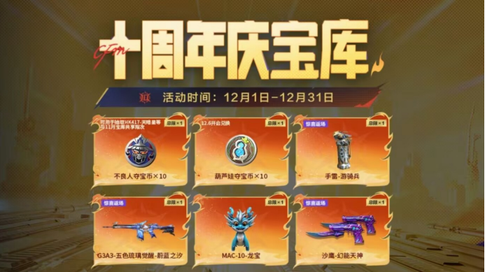 十周年庆宝库首发全新趣味掌中宝武器MAC-10-龙宝,还可兑换不良人/葫芦娃夺宝币,助你参与两大联动夺宝~更有限时优惠加持哦,仅需1枚高级十周年币即可兑换1000钻石或典藏之骰x1或英雄之钥x1,相比以往的宝库兑换,本期兑换上述道具有一定优惠~