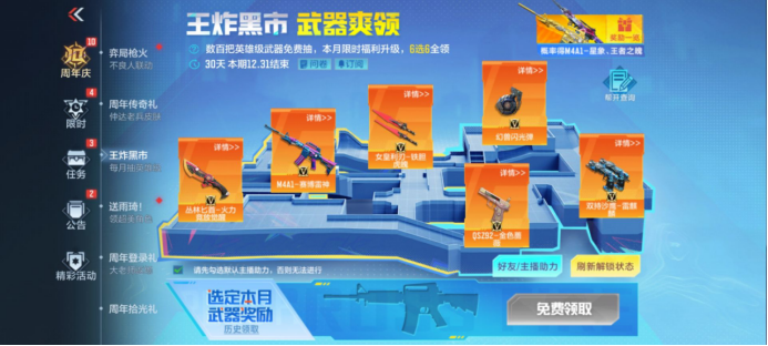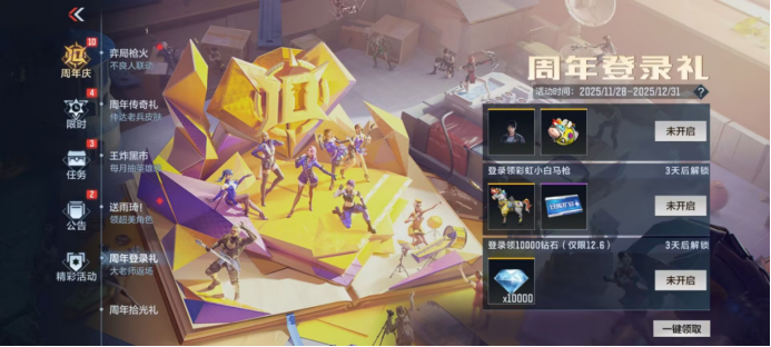 12月6日至12月31日期间,登录领取返场角色大老师和新武器彩虹小白马枪,以及趣味饰品彩虹小白马挂饰。重点来咯,12月6日当天登录领10000钻石,仅限12月6日当天哦,千万不要错过如此之多的钻石。