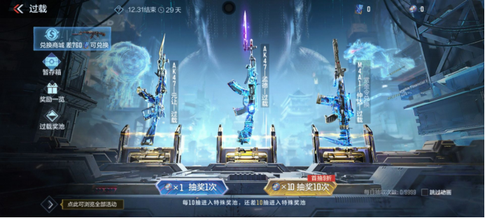 过载夺宝再次上线抽奖版块,移动速度出众的AK47-孟德和点射能力强劲的AK47-元让返场在该活动中。当然,该活动更多的是返场“过载”系列的万化道具,“过载”系列的皮肤极具科技感,每次击杀都会使枪械上的结构线变换颜色~非常好看。