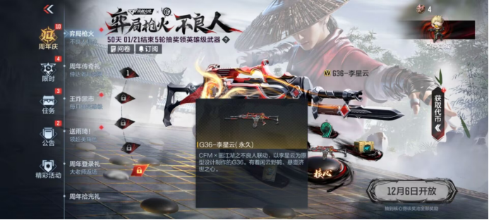 弈局枪火不良人活动将于12月6日会开放第五轮奖池,抽完第五轮即可获得永久版本的G36-李星云。该活动还返场了5-9周年相关的挂饰与头饰供大家收藏,在这十周年之际,非常具有纪念意义,强烈建议参与~