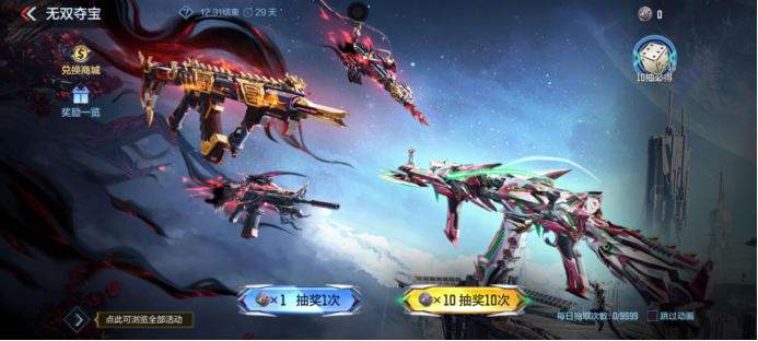 再次返场的还有无双夺宝,该夺宝活动重点返场“奉先”主副近三件套和投掷物四件套,以及它们的无双皮肤。奖池和兑换商城中还有非常多的无双系列万化,可以在“抽奖”界面找到无双夺宝。