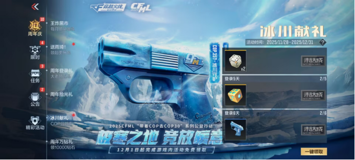 十年火线,共筑公益献爱心活动持续进行,完成登录任务即可领取丰厚奖励,累计登录6天可领COP 357-冰川守护,虽然这款枪械皮肤被冰川包裹,但它的意义是无比温暖的,并且这也是COP 357的首款皮肤哦~