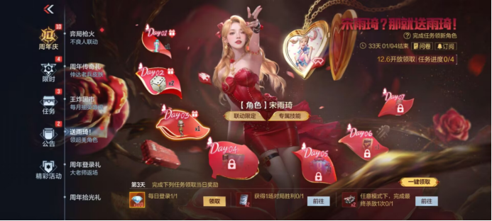送雨琦活动上线好几天了,相信大家已经完成了任意四天任务,那么~一定要记得在12月6日上线领取全新联动角色-宋雨琦!专属技能增加副武器换弹速度,可以让你更丝滑的扣COP 357哦~