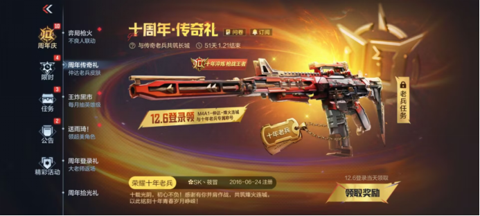 盼星星盼月亮,终于来了!12月6日,荣耀/传奇十年老兵可直接领取M4A1-仲达-烽火连城和十年老兵专属称号,淬金枪战王者完成组队绑定后可解锁皮肤领取权限。十年枪战,淬炼成金,感谢陪伴,12月6日同步开启“老兵任务”,完成任务可领取额外奖励!我们下一个十年继续携手向前~
