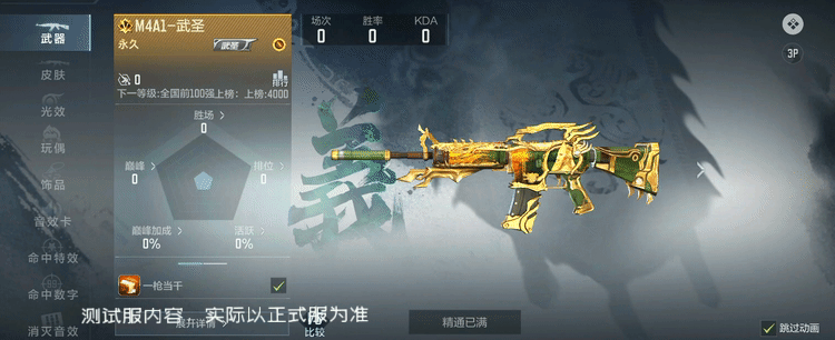 M4A1-武圣的外观是墨绿色,由金色铠甲包裹,枪身的龙形浮雕与武圣头像都栩栩如生,拿在手中犹如武圣附体,神挡杀神。同样在枪身右侧带有专属副武器,可随时切换应对突发情况。