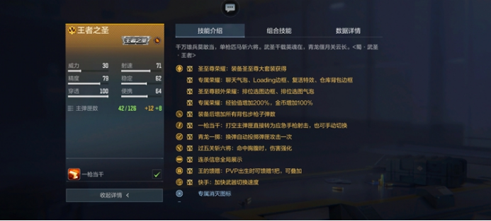 在王者之圣的属性中,比较有特色的就数一枪当千以及青龙一掷,两者的技能都非常独特,在紧急情况下能够保命。首先来看一枪当千,打空主弹匣直接转为应急手枪射击,也可手动切换。