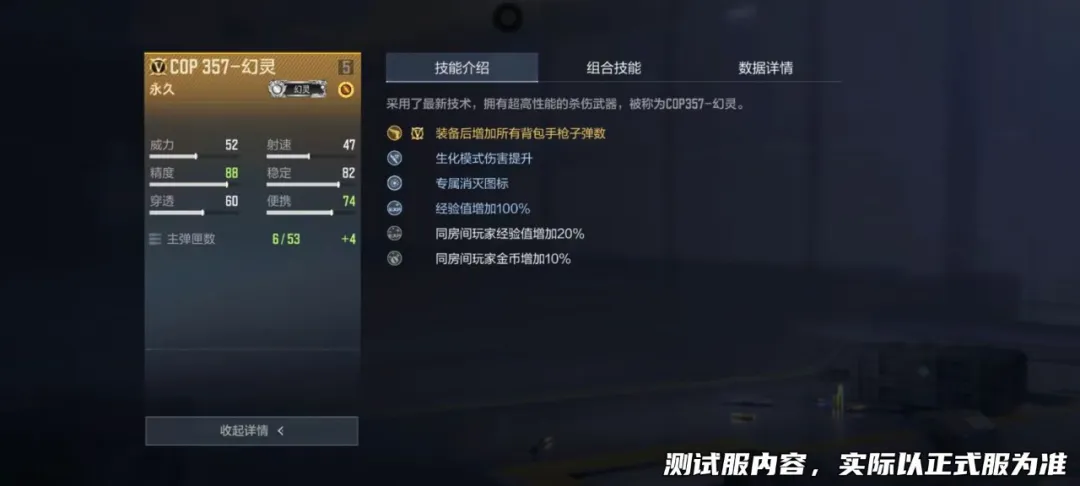 “幻灵”系列武器主要在生化模式方面有所优势,所以COP 357-幻灵也有了一条“生化模式伤害提升”的技能词条,在主武器主弹匣耗尽且没时间换弹时,可切换COP 357-幻灵继续战斗。