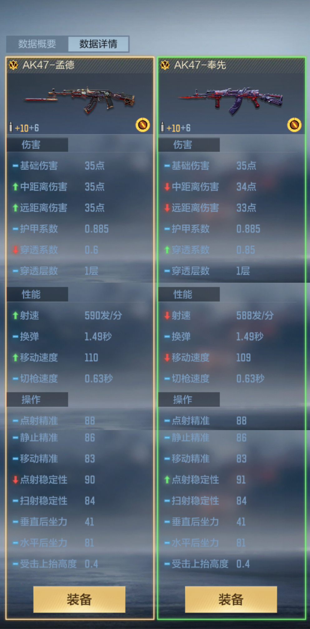 伤害方面,AK47-孟德有无距修,AK47-奉先有穿透加成;性能方面,射速和移速AK47-孟德都略胜一筹;弹道方面,点射稳定性不如AK47-奉先,但是AK47-孟德有套装的补强。