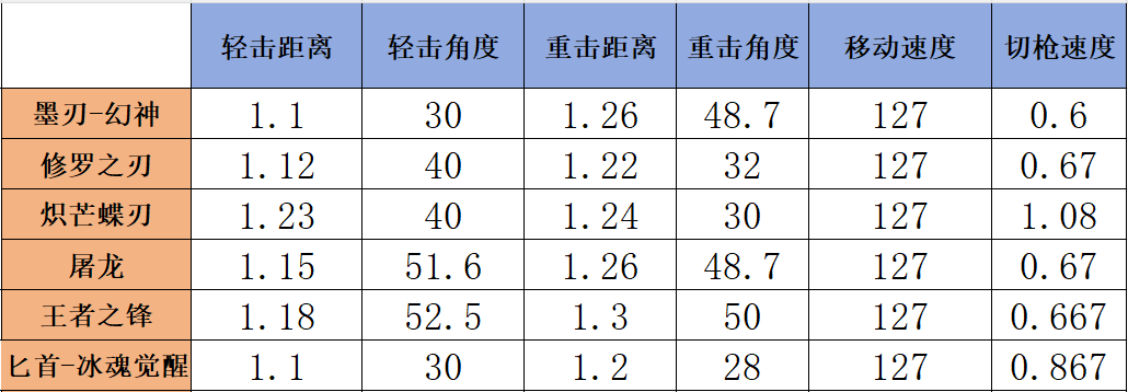 将墨刃-幻神与其他刃型武器以及屠龙系列武器进行对比,我们可以发现墨刃-幻神非常突出的一点就是“切枪速度“,它的切枪速度甚至可以比王者之锋快0.067秒。