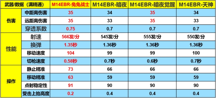 在满精通、满天赋的情况下,我们将M14EBR-兔兔战士与M14EBR-暗夜、M14EBR-暗夜觉醒和M14EBR-天神做对比,我们可以发现M14EBR-兔兔战士在各项数据面前都有着绝对优势,尤其是在穿透系数、射速、移动速度、切枪速度、移动和静止精准度和受击上抬高度方面都要比其他三把武器好很多。
