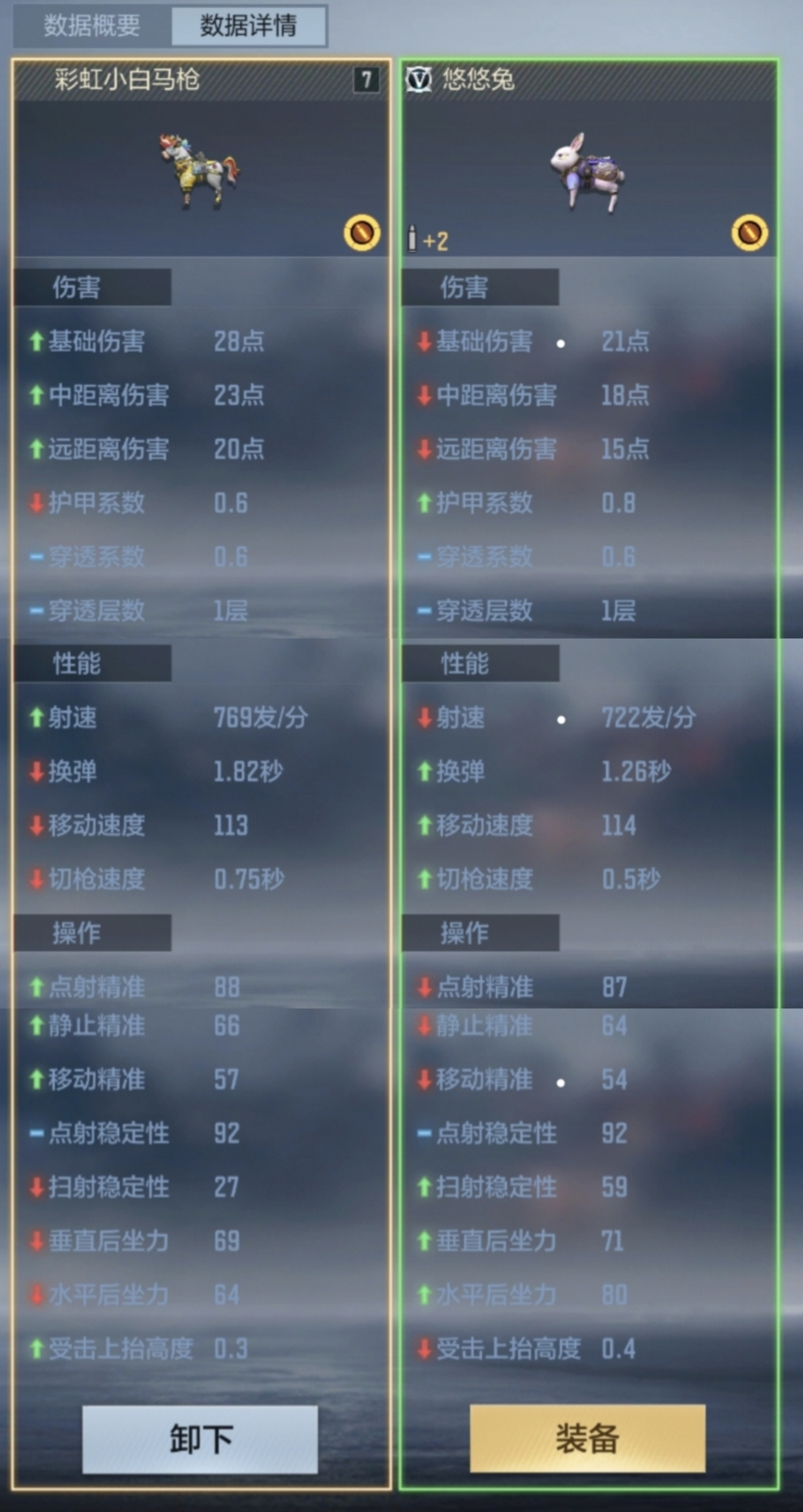 这里我们与之前版本赠送的福利武器悠悠兔对比后发现,彩虹小白马枪在基础伤害方面是完全优于悠悠兔的,同时在射速以及以及一些操作方面,都是有优化过的,但是在移动速度,换弹速度方面则是有所欠缺,可以说彩虹小白马枪是一把非英雄级冲锋枪中佼佼者的存在。