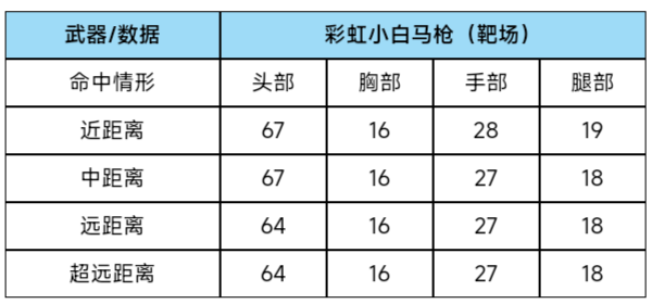 首先彩虹小白马枪的基础伤害为28点,中距离伤害为23点,远距离伤害为20点。实测后发现彩虹小白马枪在伤害表现方面如下,整体命中胸部伤害偏低,远距离命中敌人最多需要6枪才能带走敌人。