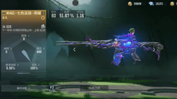 M4A1-七色宝葫-黑曜皮肤整体枪模以黑曜石打造而成,外加紫色材质点缀,瞄准架上的藤叶和蝴蝶也变成了紫色为主,更有一番韵味。枪身蕴含的巨大能量慢慢溢出形成环绕特效,枪身内部葫芦击杀敌人时会变换颜色,七种颜色按顺序变幻。