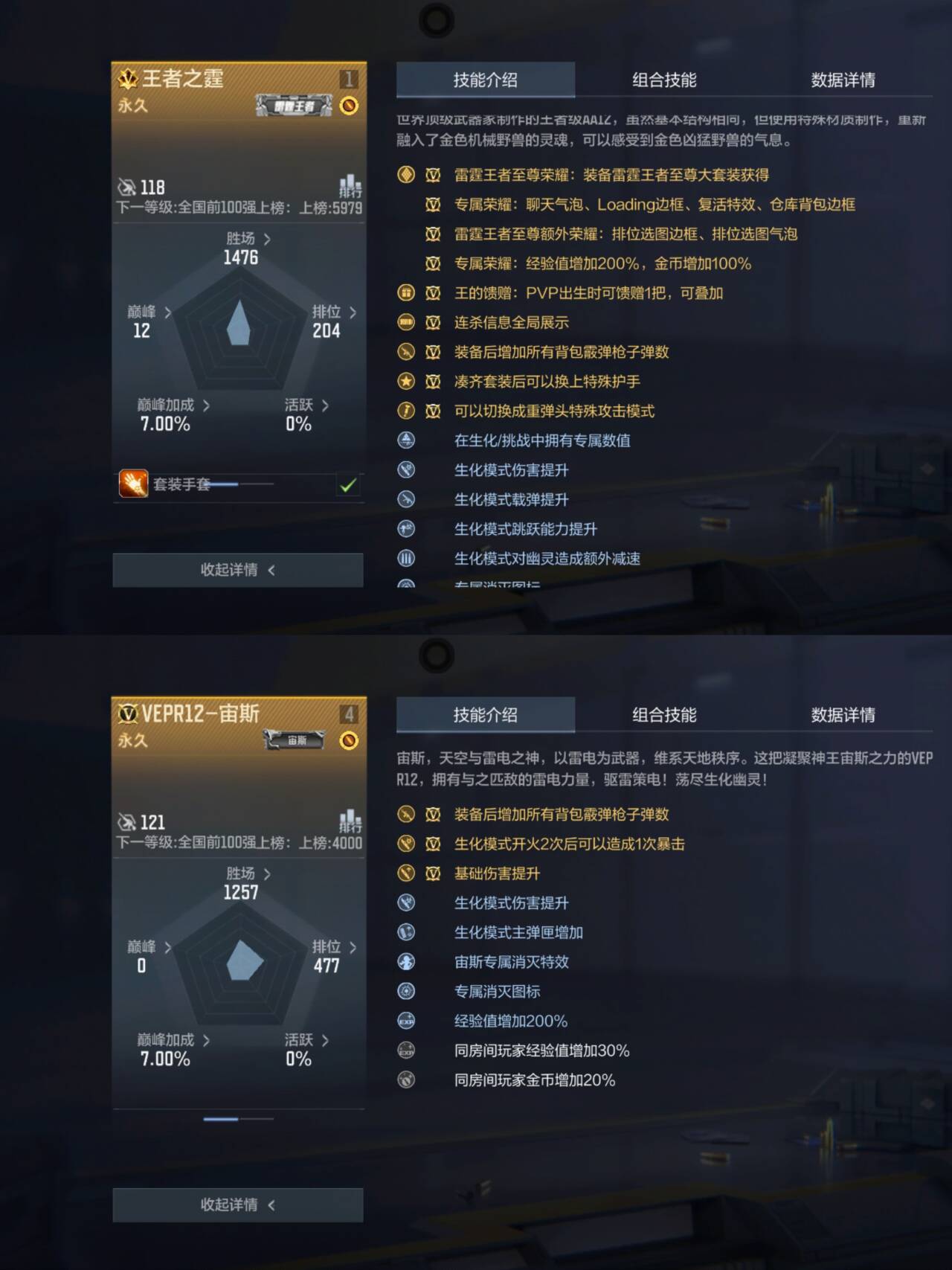首先将王者之霆与VEPR12-宙斯的武器技能进行对比,VEPR12-宙斯的优点在于生化模式开火2次后可以造成1次暴击。而王者之霆的优势在于生化模式中拥有专属数值,并且跳跃能力提升以及对幽灵造成额外减速。在武器技能方面,可以看出王者之霆的额外减速技能,能够极大提高自己的生存能力。