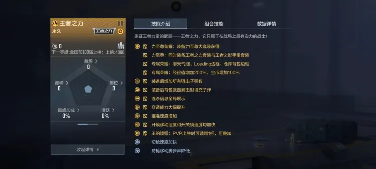 王者之力这把枪在枪械属性上拥有瞄准速度加快和穿透能力大幅提升的属性,除此之外,还拥有切枪速度加快和持枪移动脚步声降低的属性,可谓竞技狙击T0级别武器。