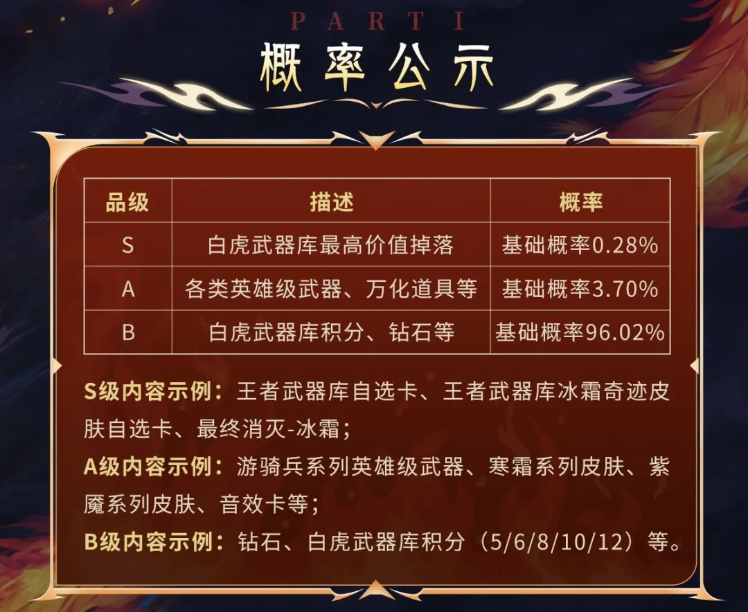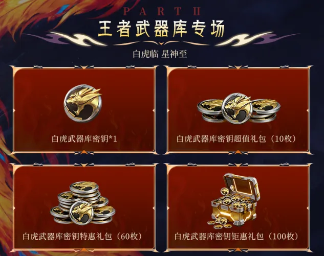 白虎武器库密钥进行抽取,奖池内含 S、A、B 三个品级的丰厚奖励。