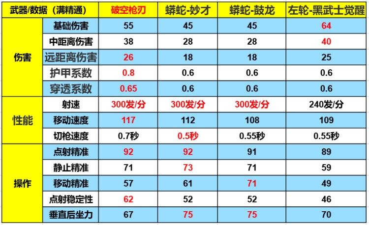 在满精通、满天赋的情况下,我们将破空枪刃与同类型蟒蛇-妙才、蟒蛇-鼓龙、和左轮-黑武士觉醒做对比,我们可以发现破空枪刃在护甲系数、射速、换弹、移动速度、扫射稳定性、垂直水平后坐力上的数值都要略高于其他两把武器,仅在切枪速度和点射静止精准方面略有不足。