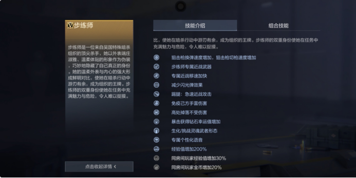 步练师自带三防属性,既有专属近战武器,还拥有踢腿:急速近战攻击,她的专属近战武器拥有移速加快的技能加成,助你抢占先机。