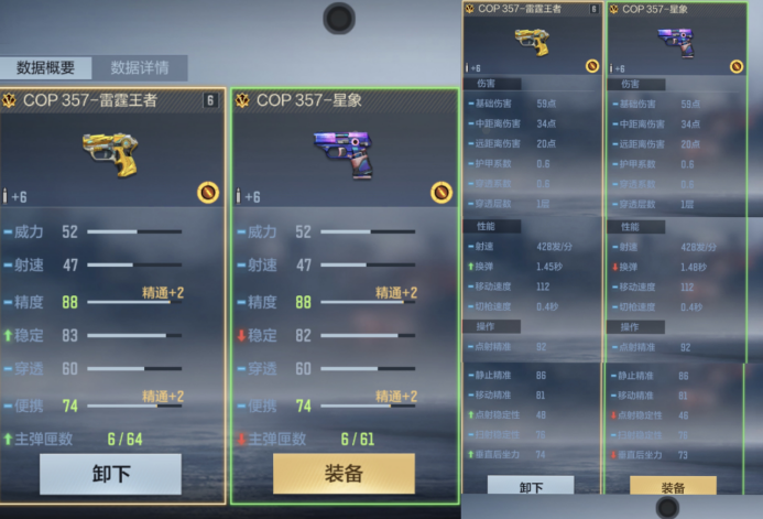 这款武器作为CF手游首款王者级别的COP,备受大家喜爱。相比于普通的英雄级COP 357如COP 357-星象,COP 357-雷霆王者在换弹速度、稳定性以及主弹匣数方面均有优势。