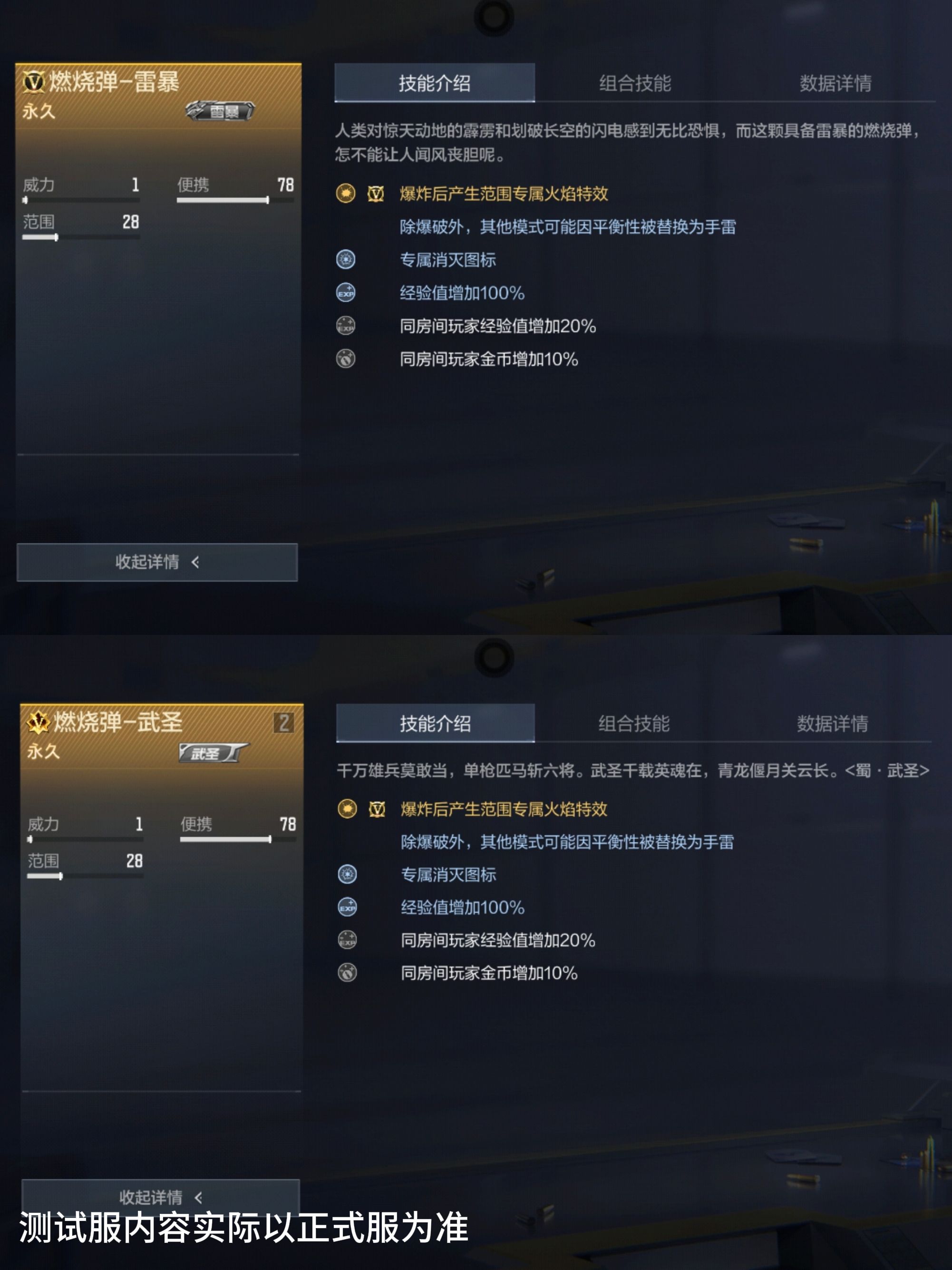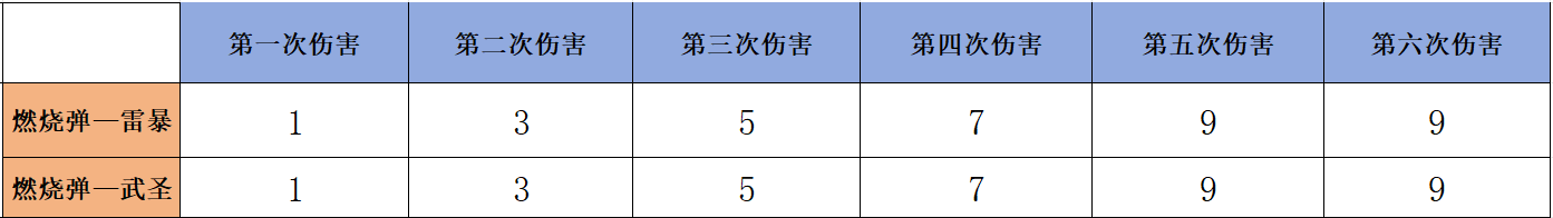 燃烧弹-雷暴和燃烧弹-武圣的技能介绍基本上是一样的,都具备“爆炸后产生范围专属火焰特效”以及“专属消灭图标”等。在组合技能下,燃烧弹-雷暴搭配雷暴投掷套装可以增加1秒燃烧弹持续时间;而且燃烧弹-武圣搭配武圣投掷套装也可以增加1秒燃烧弹持续时间。