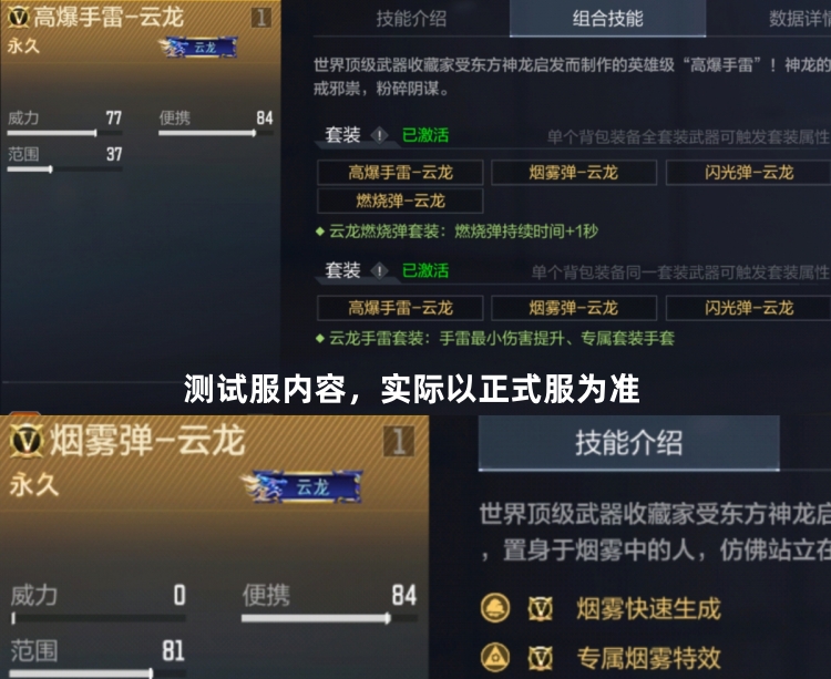 云龙投掷套装里的烟雾弹-云龙拥有烟雾快速生成效果,装备全部云龙投掷道具可激活云龙手雷、燃烧弹套装属性:手雷最小伤害提升、专属套装手套和燃烧弹持续时间+1秒。