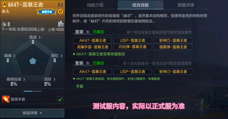 AK47-雷暴王者除了一些常规的属性之外,还拥有连杀信息全局展示以及战绩自定义保存。假如以后遇到自己失误的对局,选择不保存战绩,让自己的数据更完美。不仅如此,在生化模式中伤害、载弹都得到了提升,可以看出来AK47-雷暴王者是一把竞技生化两开花武器。