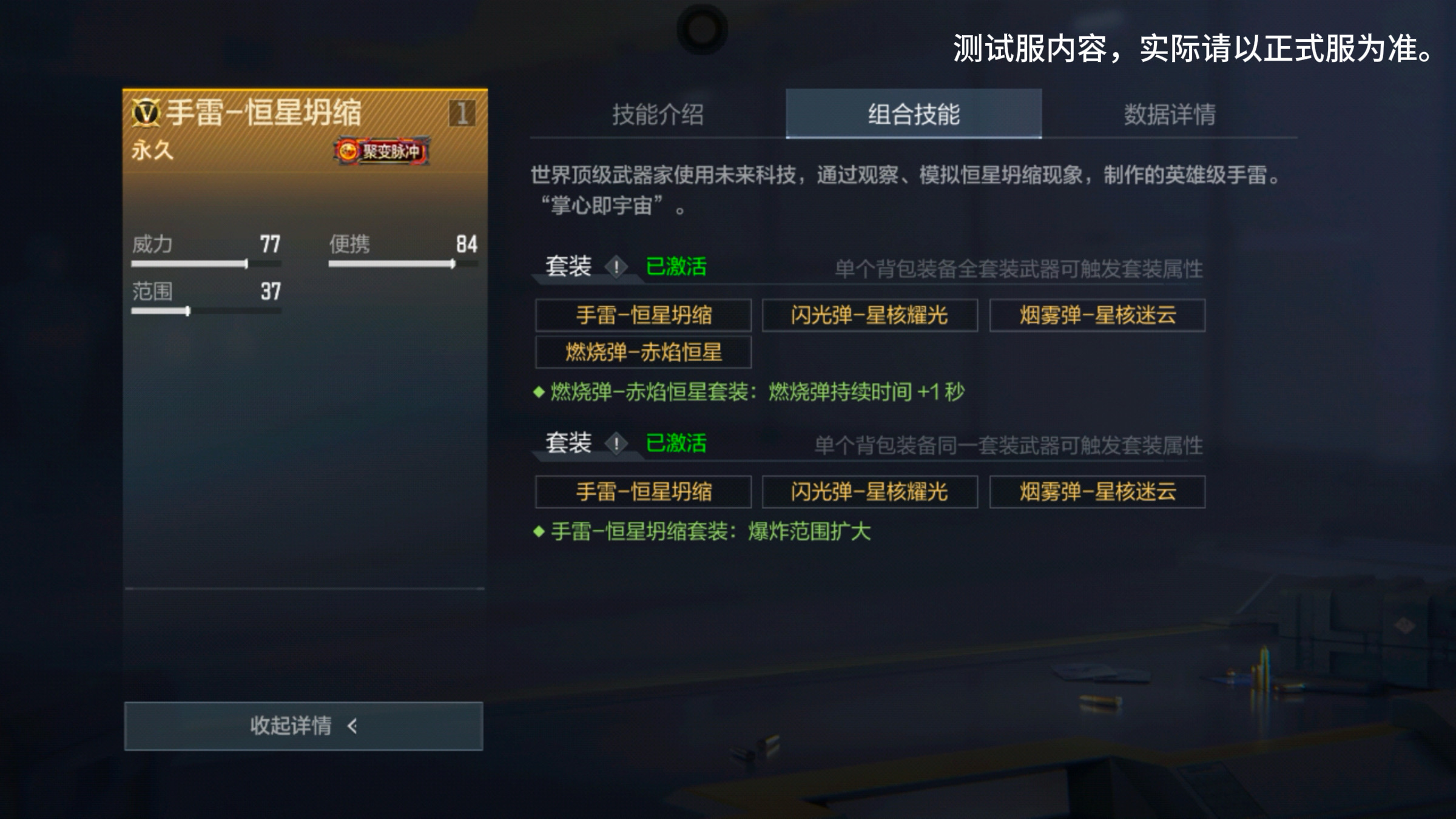 单个背包装备手雷-恒星坍缩、闪光弹-星核耀光、烟雾弹-星核迷云可激活手雷-恒星坍缩套装:爆炸范围扩大;再装备燃烧弹-赤焰恒星可激活燃烧弹-赤焰恒星套装:燃烧弹持续时间+1秒。