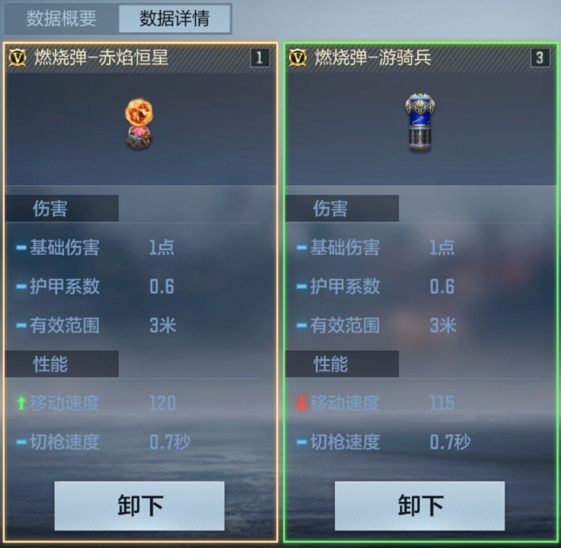 燃烧弹-赤焰恒星和燃烧弹-游骑兵进行对比,伤害方面两者持平,但在移速上达到了120点,比后者多5点,在支援转点上优势较大。